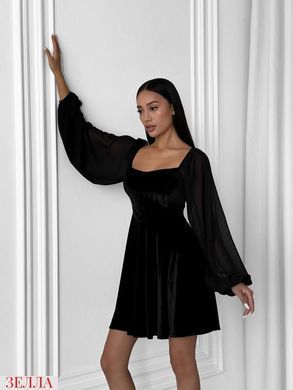 Родзинкою є напівпрозорі довгі рукави з легкого шифону, які додають сукні витонченості та повітряності. Нижня частина виконана у вигляді спідниці-кльош, яка гарно тримає форму та створює жіночний силует. Рукава можна носити спускаючи з плеча