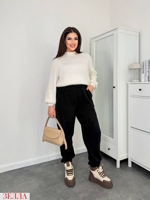 Штани з високою посадкою на поясі резинка, з боків кишені. Внизу штанини оброблені манжетами.